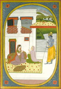 The Kangra Rasikapriya was produced under the supervision of master court artist Purkhu (active ca. 1780–1820), and the skilled landscape and large figures may indicate his hand in this painting.