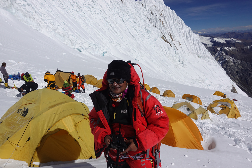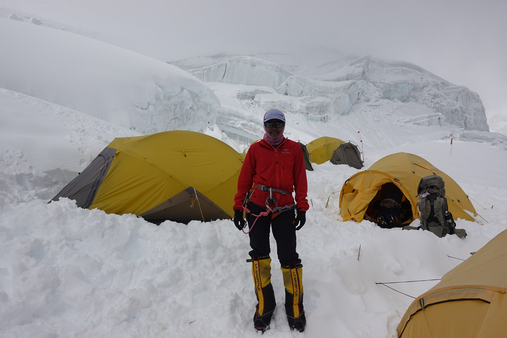 The climb from Camp 1 to Camp 2 is a very steep one involving vertical climbs prone to active icefall. Camp 2 forms the technical section of the climb located at the top of the Serac section on a flat area. At 6,400 mtrs, it is sheltered by a series of ice cliffs. After that Aparna descended to the Base Camp and waited anxiously for a suitable window to reach the summit.