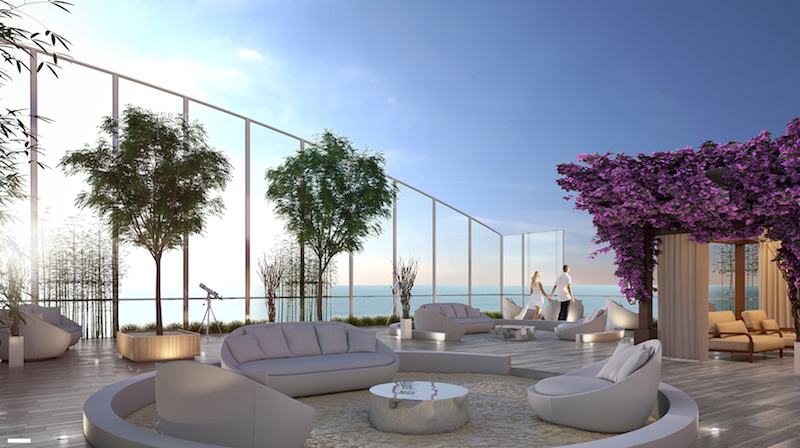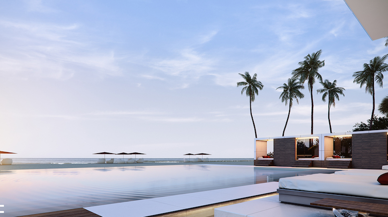 Rather than a pool atop a conventional parking podium, the tranquil vanishing-edge pool sits glistening, overlooking the ocean, just INGENUITY Blueprint of steps outside the building’s ground level.