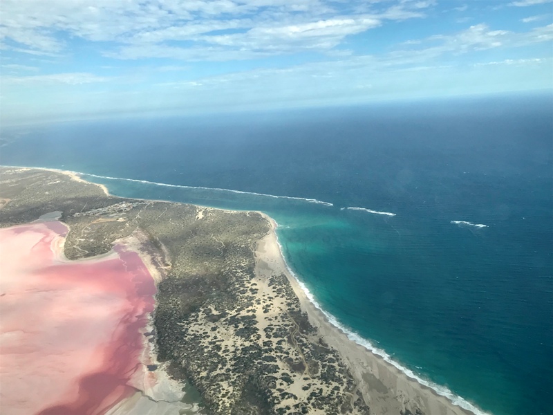 The site, located in between the city of Geraldton – Coral Coast’s most prominent urban settlement with an airport and Kalbarri National Park – an iconic natural spectacle, is best glimpsed from the top by sitting on a scenic flight which in addition flies over an array of towering coastal cliffs and dramatic gorges. Most impressive is to see the pink colour of the lake contrasting with the turquoise blue of the ocean and green of the nearby vegetation.