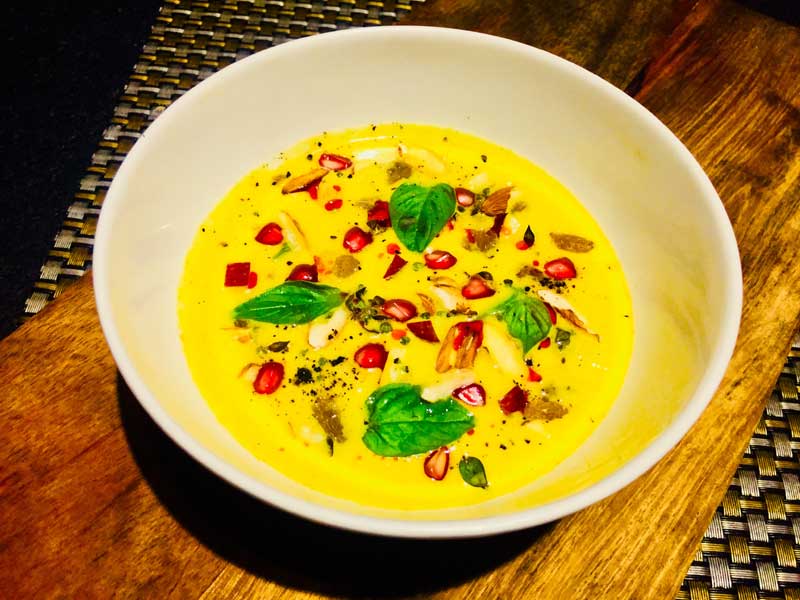 There is a range of Cold Soups like ‘Gazpacho Andaluz’ (made with tomato, cucumber, capsicum, red onion, red wine vinegar & extra virgin olive oil), ‘Fire and Ice Soup’ (a sweet and sour cold soup made with water melon, carrot, red pepper & walnuts with extra virgin olive oil & little tobacco) and ‘Curried Apple Soup’ (with raisins, sliced almonds, with a touch of apple cider vinegar & extra virgin olive oil).