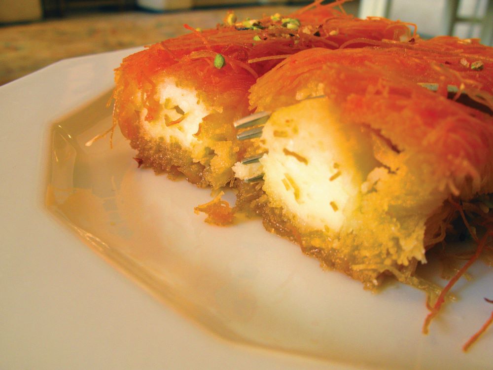 Kanafeh: Kanafeh is a traditional dessert made with thin noodle-like pastry, or alternatively fine semolina dough, soaked in sweet, sugar-based syrup, and typically layered with goeey melted cheese-- the combination of sweet and salty makes it a treat to remember.