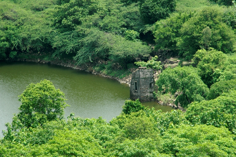Medhi Talao was a large man-made pond at such a strategic point that it gathered almost all the rainwater flowing down that part of the hill, for use by people during the hot summer months. The talao [pond] had stone steps all around it, which made it easy to access and use for local people and pilgrims. There was also a square structure jutting out, like a tower, on the edge of the pond.