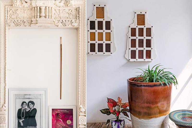 So there’s a beautiful antique chaukhat that serves as a frame for a lone paintbrush; one that’s a personal gift from M.F. Hussain and has been signed by the artist.