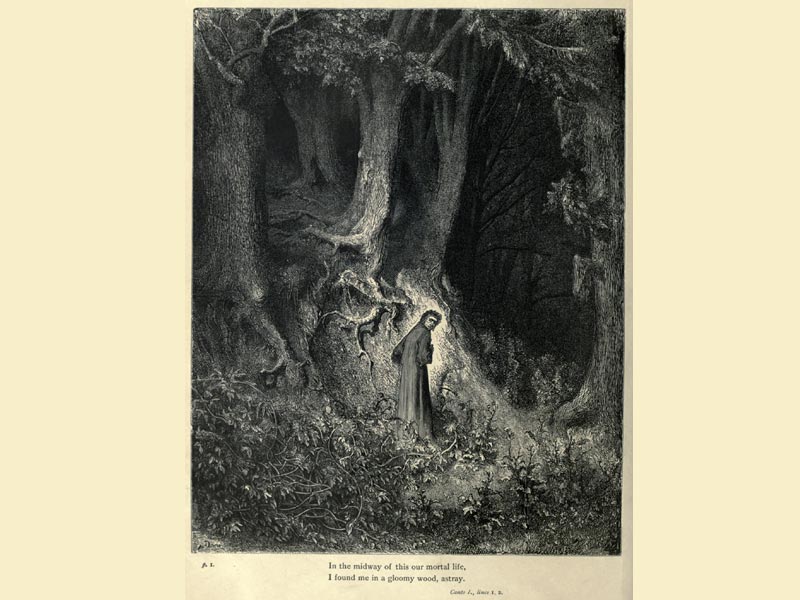 Dante finds himself lost in a gloomy wood, from Canto 1 of Divine Comedy, illustrated by Paul Gustave Doré (1832-1883). The image is from an 1861 edition of Dante's Inferno, the first part of the poem. (Wikipedia, Public Domain)