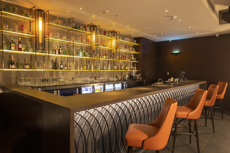 The lounge and bar (with its private smoking room) decked in cove lighting, striking wall art, a long bar with orange bar stools, bar back designed in a rose gold and jet black metal finish, exude a plush but informal ambience.