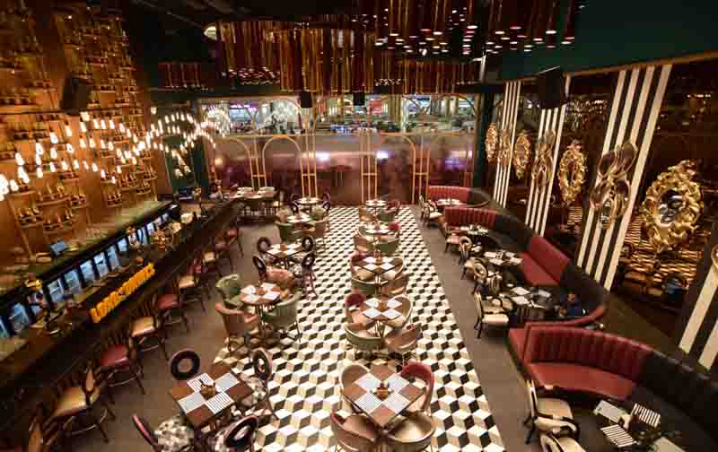 The 40 ft. double-height bar has an upper frame for the bartenders with over a whopping stack of 800 bottles, and the lower platform is for the public to enjoy their time. Captivating music, signature cocktails and classy décor—16 chandeliers and 22 lion heads adding to its royal feel, Lord of the Drinks showcases a strong neo-classical and neo-modern influences.