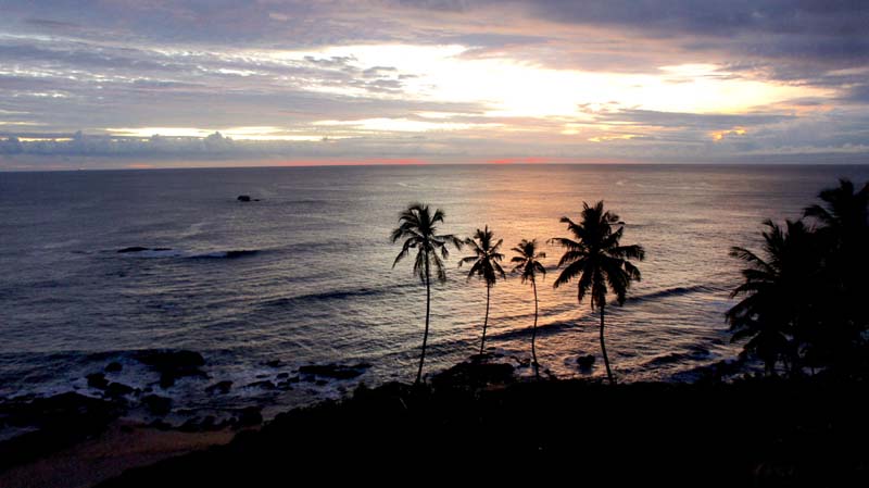 The overlapping layers of crimson red, blue, grey and yellow had turned the sky over the ocean into a canvass which only god can paint. A few wind-swept coconut trees silhouetted against the setting sun only added to the magic of the evening.