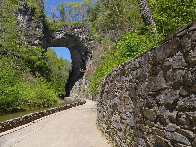 Natural Bridge State Park. Natural Bridge was listed on the National Register of Historic Places as a National Historic Landmark in 1988 and in 2016 became Virginia's 37th state park. The spectacular 215-foot-tall Natural Bridge consists of horizontal limestone strata and is the remains of the roof of a cave or tunnel through which the Cedar Creek once flowed. In addition to the stunning bridge, this state park features seven miles of hiking trails, including Cedar Creek Trail which leads visitors under the bridge to the Monacan Indian Village, and Lace Falls with its 30-foot cascade. The park also recently became Virginia's fifth