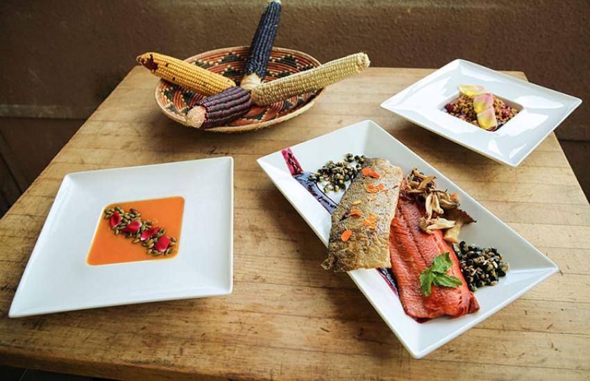 The Indian Pueblo Kitchen, located at the Indian Pueblo Cultural Center, is centered around indigenous cuisine education and exploration and carries on the tradition of creative, Native American culinary artistry and Pueblo hospitality. Here, each meal focuses on a direction or region of the country, a corresponding corn color, and precontact Indigenous ingredients.Chef Ray Naranjo Introduced a 3-course meal that features a squash bisque topped with toasted pumpkin seeds, cedar-smoked salmon accompanied with blue corn and truffle-scented roasted mushrooms, and a wild berry compote for dessert.
