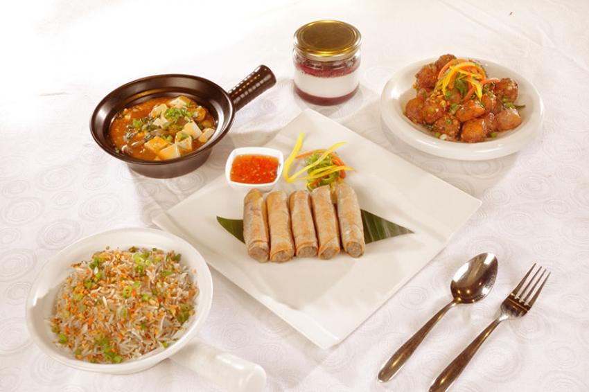 The meal from Pan Asian includes vegetable spring rolls, Naan Thod, wok tossed young potatoes with chili tamarind sauce, Mapo Tofu, fresh bean curd and mushrooms with spicy chili paste and spring onion, fish in three flavour sauce served with Teppanyaki garlic fried rice and Wild Berry Panna Cotta, to name a few.