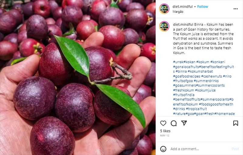 The outer red cover of the Garcinia indica plant, popularly known as kokum, is used a souring agent across the Konkan coast of India. In summer, the semi-dry fruit covering (with added sugar syrup and seasonings) is used to make a most refreshing drink. A very popular drink found in Maharashtra nd Goa.