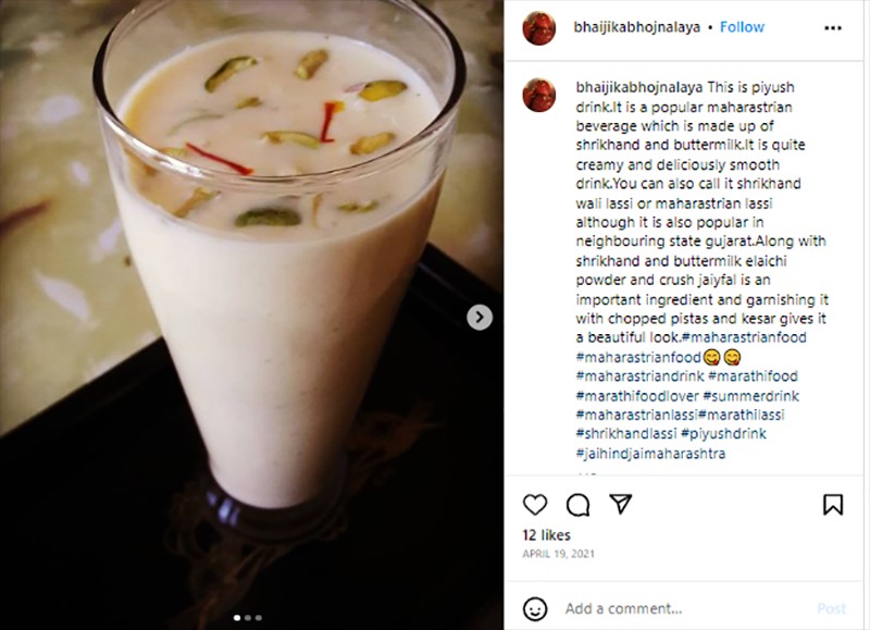 It essentially consists of a mixture of shrikhand (a milk-based dessert) or curd (yoghurt) in chaas to which a variety of flavourings (such as saffron, cardamom, etc.) are added for taste. A layer of crushed dry fruits is layered on top of the creamy textured drink. It is mostly consumed in Gujarat and Maharashtra.