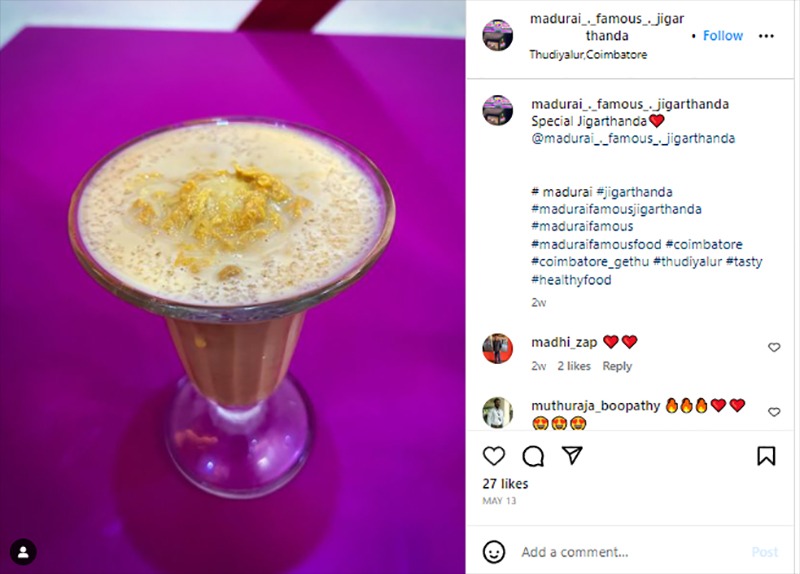 A must have when you are visiting Madurai in Tamil Nadu, this drink is usually made by mixing almond gum, sarsaparilla (nannari) root syrup and sugar in milk, to which one may add Basundi (a milk based dessert) or ice cream.