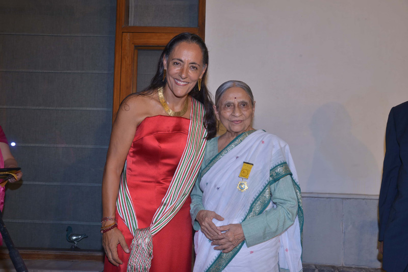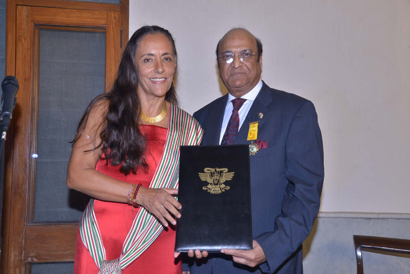 Melba Pría, Ambassador of Mexico to India, presented the Decoration of the Mexican Order of the Aztec Eagle to Dr. Raghupati Singhania, Chairman & Managing Director, JK Tyre & Industries Ltd, President of JK Tornel S.A. De C.V., Mexico; Ambassador Chokila Iyer, former Indian ambassador in Mexico; and Mrs. Ela Bhatt, social activist and founder of women’s organization SEWA.