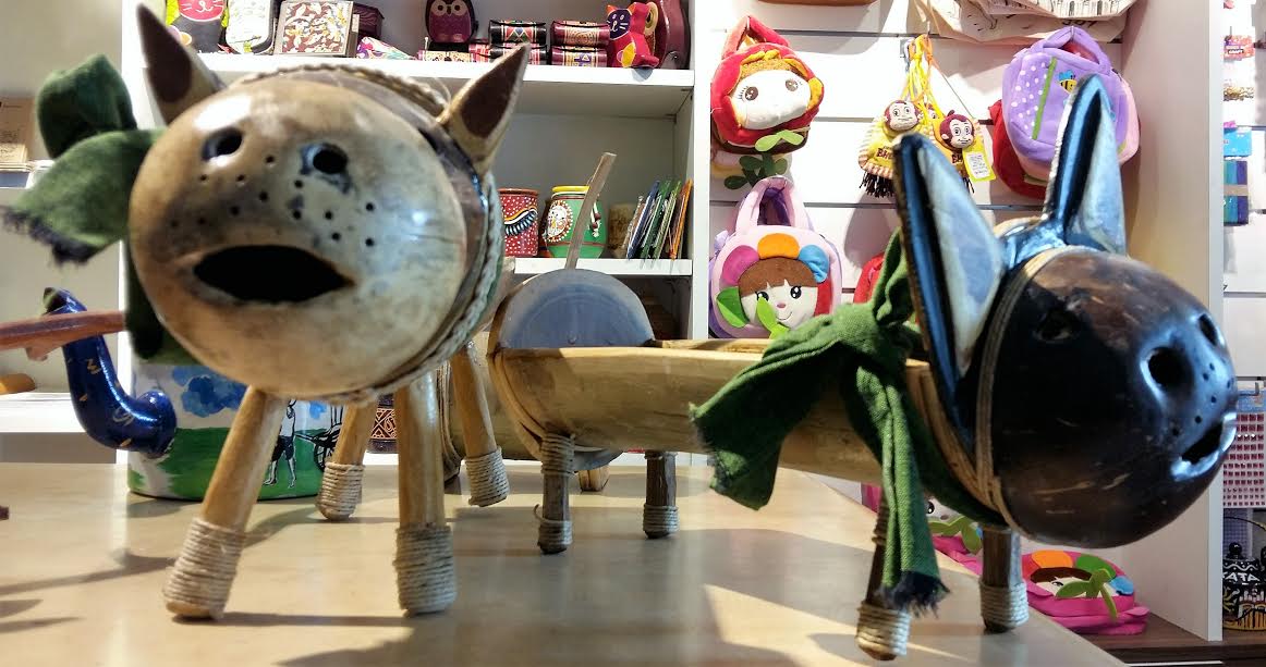 "We try to make our products as environment-friendly possible," said salesperson Md Rizwan as he pointed to a cat-shaped serving tray, with a piece of hollowed out bamboo for a body and a coconut shell for a head.