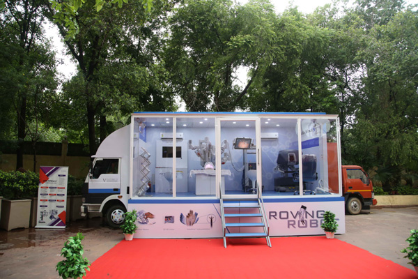 To address the scarcity of trained surgeons and the cost of computer assisted procedures and equipment Vattikuti Technologies and Intuitive Surgical Inc. USA and Vattikuti Foundation will showcase the technology by mounting the surgical robot on a mobile vehicle to simulate an operation theatre setting as it educates doctors and surgeons about the benefits.