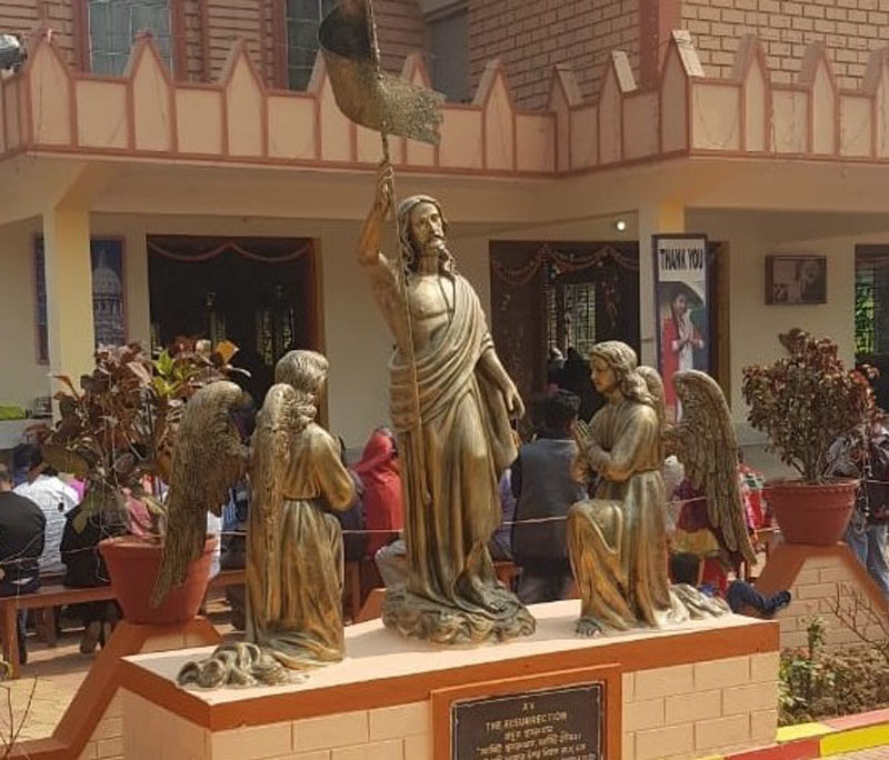 The Infant Jesus Church has a statue of Jesus under an imposing banyan tree seated in a lotus position imparting his teaching and blessings to all. This is in accordance with the popular tradition of open air classes started by Kabi Guru Rabindranath Tagore.