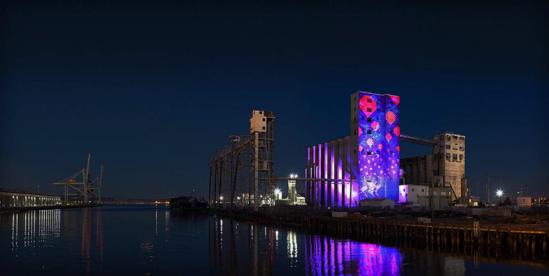 Helical Trace: A permanent installation inside the new LUMA Hotel in Mission Bay, Helical Trace is local artist Jim Campbell’s newest contribution to San Francisco’s Light Art Trail. The dynamic light installation can be seen from the street through the lobby’s floor-to-ceiling three- story windows. The prolific artist who installed Day for Night atop the Salesforce Tower created this striking installation that looks different from every angle and uses the reflection of the windows to amplify its movement. At a distance, the helix form gives the illusion of water across light. The figures within climb an infinite stretch of waterfall, allowing Campbell to create delight out of physical struggle.