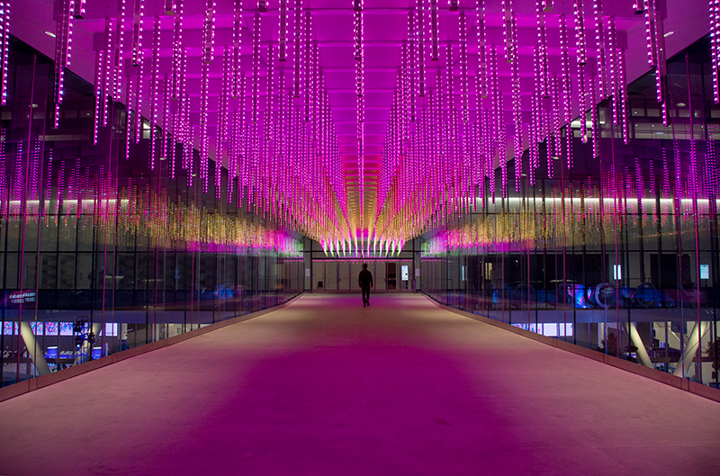 Lucy in the Sky: One of two new light art installations joining the City’s extensive Civic Arts Collection, Erwin Redl’s Lucy in the Sky is a landmark artwork in the city’s new Central Subway (first opening for weekend service on Nov. 19). Located in the Union Square/Market Street Station, the immersive installation is comprised of over 500 translucent 10 x 10-inch light panels, each containing an array of color LEDs. The panels are suspended along the entire length of the concourse level’s ceiling, spanning nearly 670 feet. Installed in a diamond-shaped pattern, the light panels are computer programmed to slowly change color and display simple patterns, creating a kaleidoscopic experience.