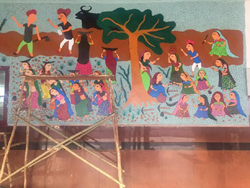 Floral motifs from Badal Mahal are being used to decorate the station in Bikaner while Udaipur is using representations from the Mewar School of Art. Mewar painting is one of the most important schools of miniature painting of the 17th and 18th centuries developed in principality of Mewar. The works of the school are characterized by simple bright colour and direct emotional appeal. An increasing number of paintings were concerned with portraiture and the life of the ruler, though religious themes continued to be popular.