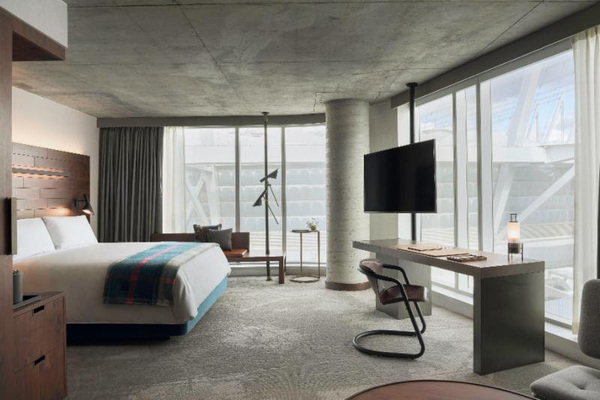 The DOUGLAS offers 178 rooms and 10 suites, including three two-story lofts on the 16th and 17th floors, all decorated with warm woods and task lighting. In-room amenities include purely natural Aesop products; detoxifying charcoal water; Douglas fir-infused gin crafted by a nearby distillery; and locally sourced refreshments.