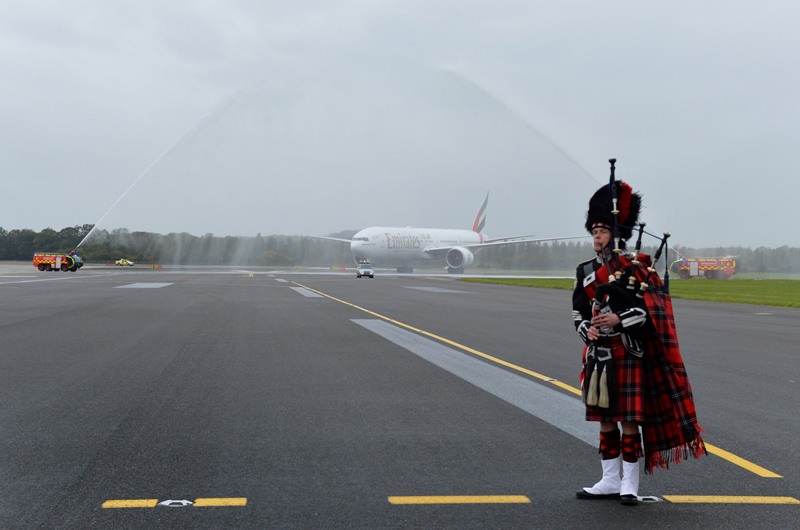 The Emirates Boeing 777-300ER touched down in the Scottish capital just before 3pm local time, making Edinburgh the airline’s second destination in Scotland and the eighth in the United Kingdom.