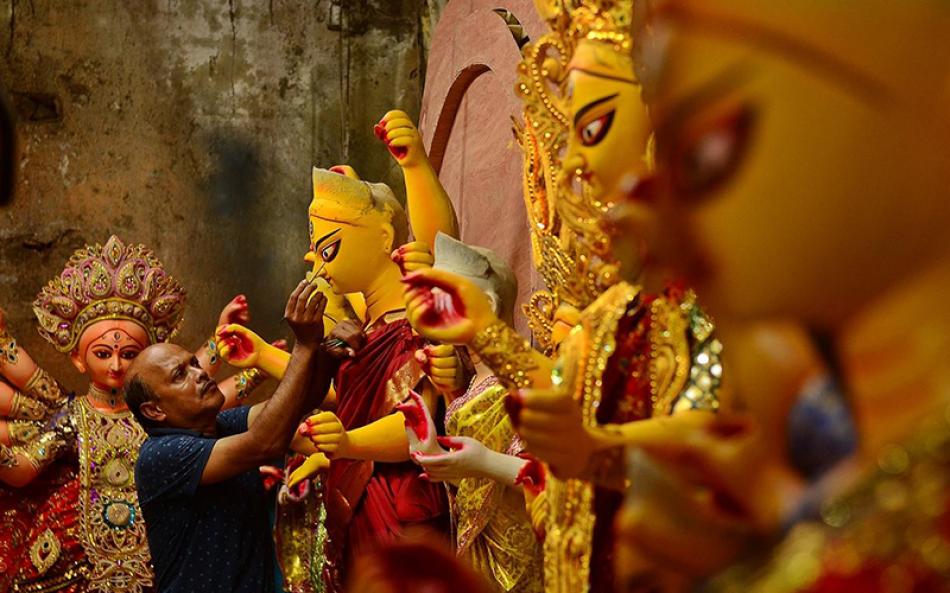 Kolkata gears up for Durga Puja with traditional Mahalaya tarpan and the symbolic 'Chokkhudan' (painting of the eyes of the goddess) ceremony. The Hooghly river tarpan and Chokkhudan marks the start of Durga Puja festivities in Kolkata. Ar ...