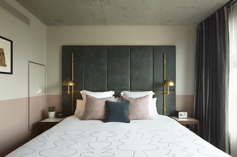 The rooms, the hotel says, draw inspiration from the area's industrial past with its ceilings sporting an unfinished look. All rooms have mid-century furniture, artwork curated by local gallerists Johalla Projects, comfortable beds with custom bedding created by artist Cody Hudson, dark green or brown leather headboards, brass bed lamps, custom-designed rugs, Marshall radios, and walk-in showers with herringbone tilework.